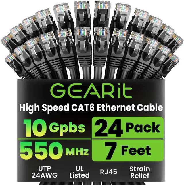 High-Performance Cat 6 Ethernet Cable Pack GEARit's 24-pack of 7 ft Cat6 ethernet patch cables features 24 AWG UTP stranded conductors twisted in an X-structure spline to minimize crosstalk and deliver full 10 Gbps bandwidth - future-proof network cables for home, office, data-center, and server use. ^^ Advanced Cat6 Technology Engineered to meet or exceed TIA/EIA-568-C. 2 standards, these Cat6 ethernet cables offer up to 550 MHz of throughput at a Cat5e price. Fully backwards compatible with Cat5/5e networks and ready for 10-Gigabit Ethernet applications. ^^ Reliable, Secure Wired Connection Say goodbye to Wi-Fi dropouts - this Cat 6 network cable (aka ethernet cable Cat 6 or RJ45 patch cable) provides rock-solid LAN connections for PCs, servers, routers, printers, gaming consoles, and more, ensuring low-latency, interference-free data transfer.
