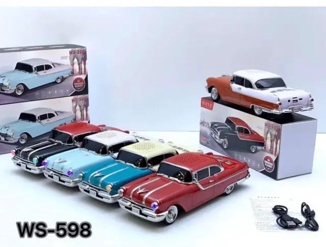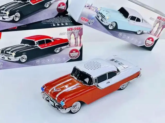 CLASSIC DESIGN: Vintage car-shaped Bluetooth speaker featuring iconic 1950s styling with chrome accents and two-tone color schemes ^^
