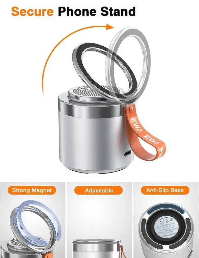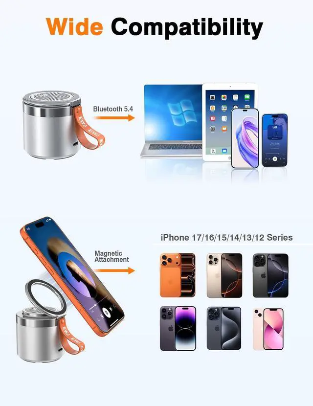 Universal Compatibility: The speaker pairs effortlessly with any Bluetooth-enabled device (iPhone, Android, iPad). For the strongest magnetic hold, we recommend using it with a magnetic phone case or a case with a metal plate.