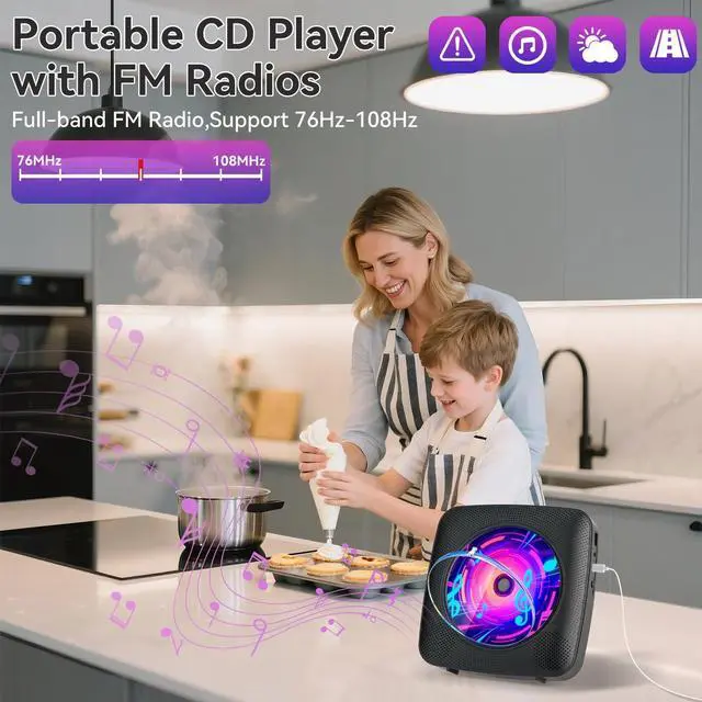 2. Bluetooth Hi-Fi Speaker, 3. FM radio, 4. USB Flash Drive Player, 5. 3.5 mm audio player. Support CD, CD-R, CD-RW, CD-MP3, CD-WMA. Built-in FM radio, support 76MHz- 108.0MH z. The advanced anti-skip function ensures the cd player won't stop playing even with shaking, bumping, or driving on bumpy roads. ^^ Desktop & Wall Design CD Players for
