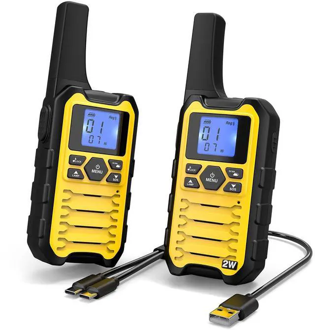 Quick-Pair in seconds Press one key to sync and talk; ideal for classrooms, church ushers, event staff, warehouses and camping caravans. ^^ Clearer indoors with 2W FRS Stronger coverage through halls, aisles and high-rise corridors; switch to a less-crowded channel and add a privacy code to cut cross-talk. ^^ Rechargeable power that lasts Each radio includes 31500mAh AA NiMH; auto battery-save helps support all-day use. ^^ USB-C split charging 1-to-2 USB-C cable charges two radios from one port (power bank, car or wall) for quick top-ups on the go.