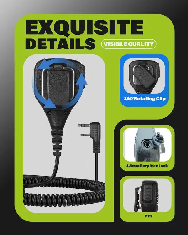 PERFORMANCE: High-quality microphone with -213 dB sensitivity at 1 kHz ensures clear and precise voice transmission ^^ 360 Rotatable Clip for Flexible Mounting Features a fully 360-degree rotatable clip, allowing you to securely attach the speaker microphone to your jacket, vest, backpack strap, or duty belt.