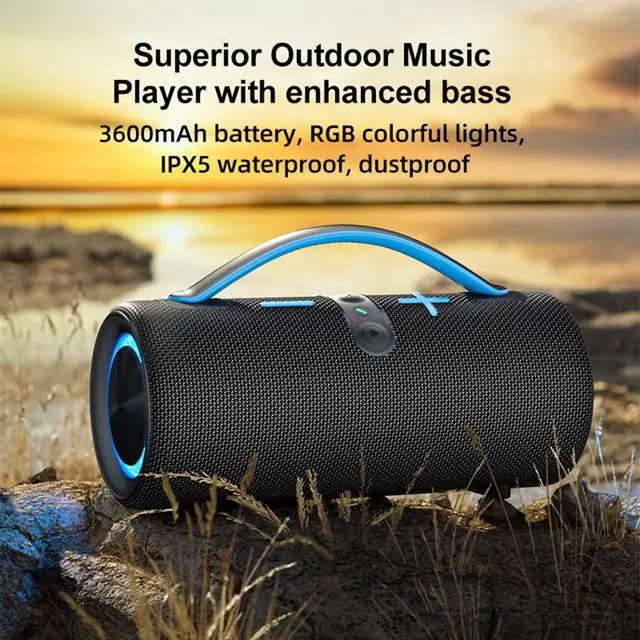 Great for parties or gatherings, functioning as a portable wireless party speaker for versatile playback anywhere ^^ 11 Dynamic RGB Light Effects Customize your vibe with 11 unique lighting modes that sync with your music, turning this into the ultimate wireless waterproof bluetooth speaker with lights for indoor or outdoor fun ^^ Long-Lasting Battery with Type-C Charging The built-in 3600mAh rechargeable battery offers up to 6.5 hours of continuous playback, making this the ultimate outdoor portable bluetooth speaker for camping, hiking, and travel ^^ Multiple Playback Options & Hands-Free Calls Play music your way with Bluetooth 5.3 + EDR, TF card, USB drive, and AUX input.