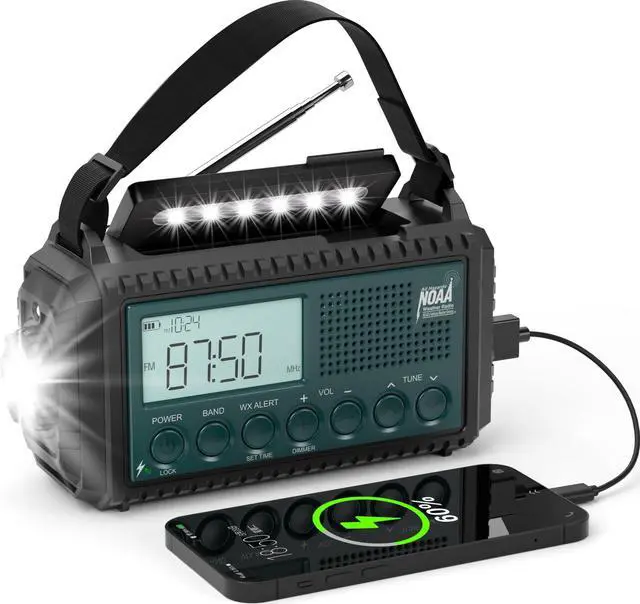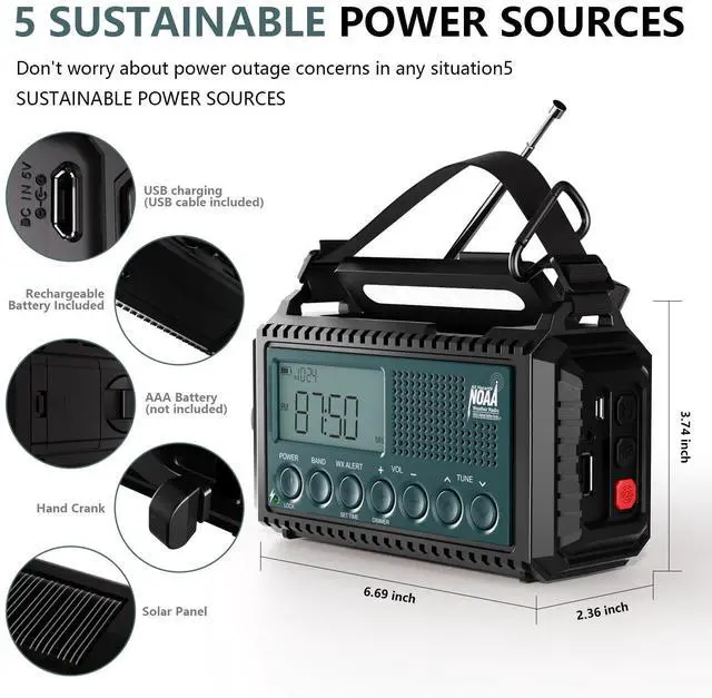AUTOMATIC NOAA WEATHER ALERT RADIO WITH TIME DISPLAY: No need to listen to the radio all the time before you receive the NOAA warn information! This can also work as a clock, or you can just turn it off to save battery life. Dont worry, as long as you set the automatic weather alert in advance, this will turn on automatic and warns you with loud alarm and flashlight red light. ^^ 5 WAYS POWERED WITH LONG LASTING 5000