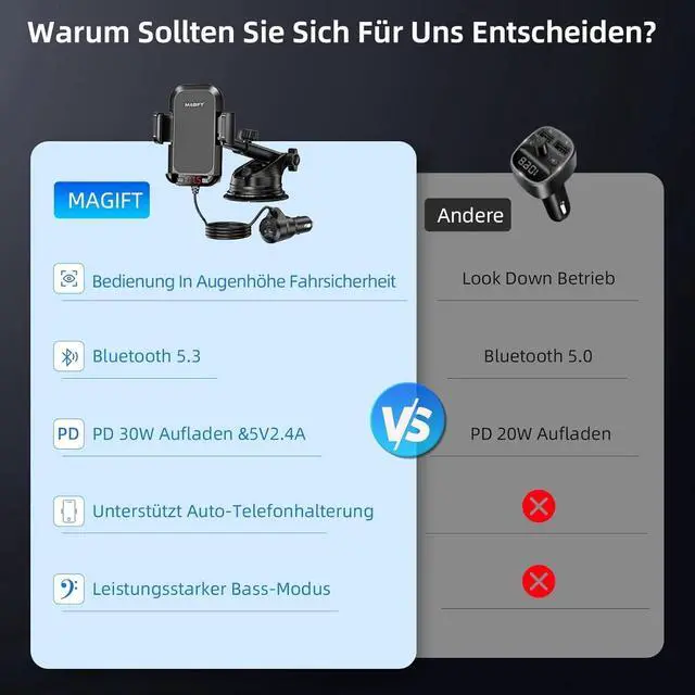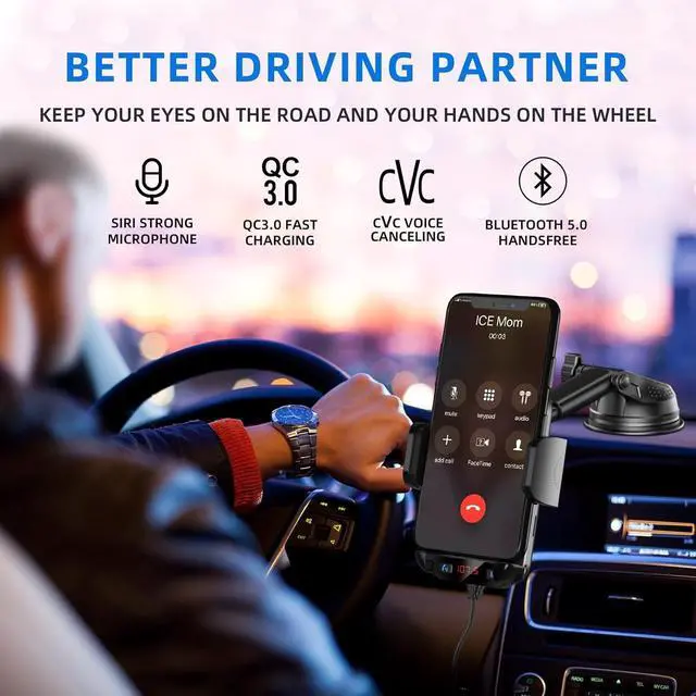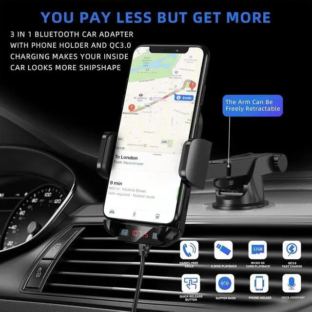 THREE-IN-ONE BLUETOOTH CAR ADAPTER WITH PHONE STAND - Utilizing the latest Bluetooth 5.3 technology, it can complete pairing in just 1 second. Once the initial successful pairing is completed, no further pairing operations are required. The included phone stand fully demonstrates the multi-functionality of this device ^^ CLEAR CALLS - This bluetooth transmitter is equipped with an advanced dual-microphone system and noise reduction technology, ensuring clear and uninterrupted calls ^^ SAFE AND EFFICIENT CHARGING METHOD - This car radio is equipped with two USB interfaces (one of which is a Type-C interface), capable of charging two devices simultaneously and preventing overcharging.