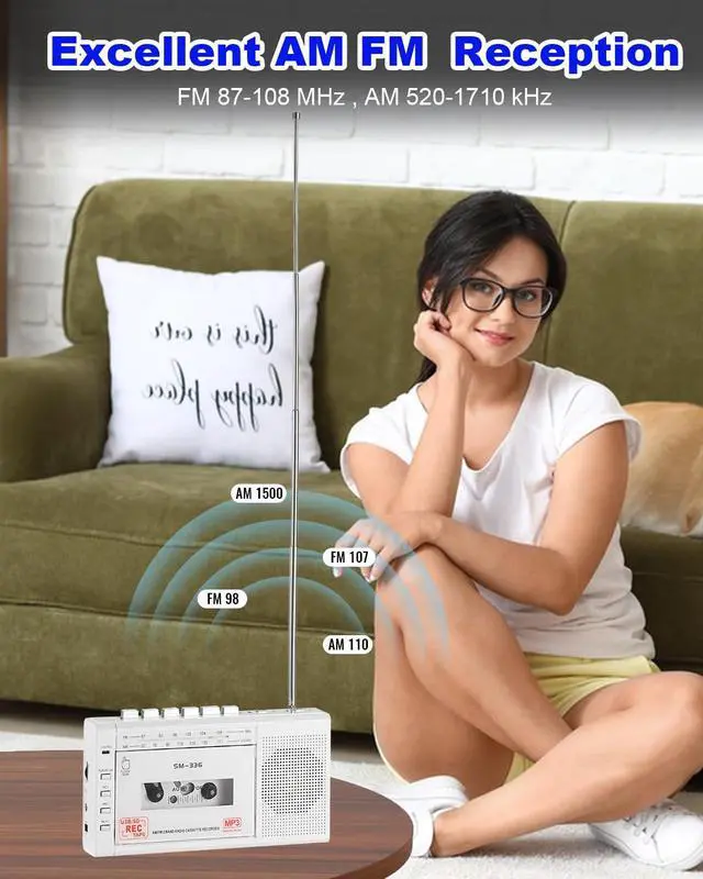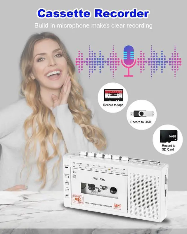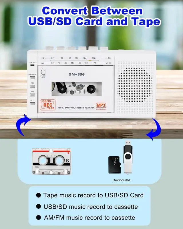 Versatile Cassette ConverterTransform your cherished cassette tapes into digital formats with our advanced audio cassette to digital converter. This cassette tape player with USB functionality allows you to easily convert audio to USB or TF Card, preserving your memories for years to come. ^^ Multiple Recording OptionsEnjoy the freedom to capture audio from the radio or record your own voice onto blank tapes or directly onto a USB/TF card using the built-in microphone, and also play MP3 music directly from your USB or TF card. ^^ Excellent Sound QualityFeaturing exceptional AM/FM reception with a long antenna, alongside a built-in 3W loudspeaker, this walkman cassette player delivers impressive sound quality.