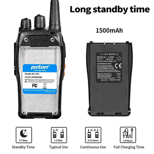^^ Durable Battery: The walkie-talkie is equipped with a reliable 1500mAh lithium battery, built to last. Under normal usage, it can last up to 120 hours on a full charge or up to 12 hours of continuous usage. Actual battery life depends on your frequency of use. A full charge typically takes 3-4 hours.