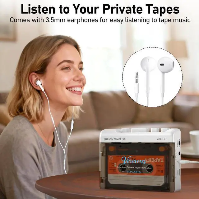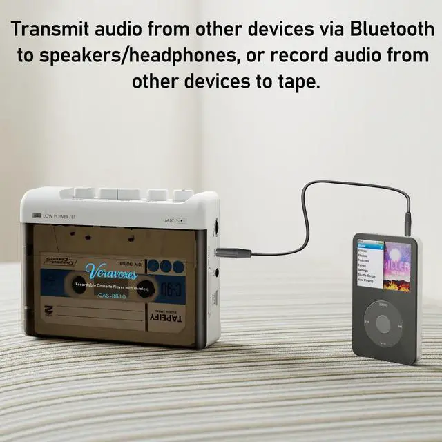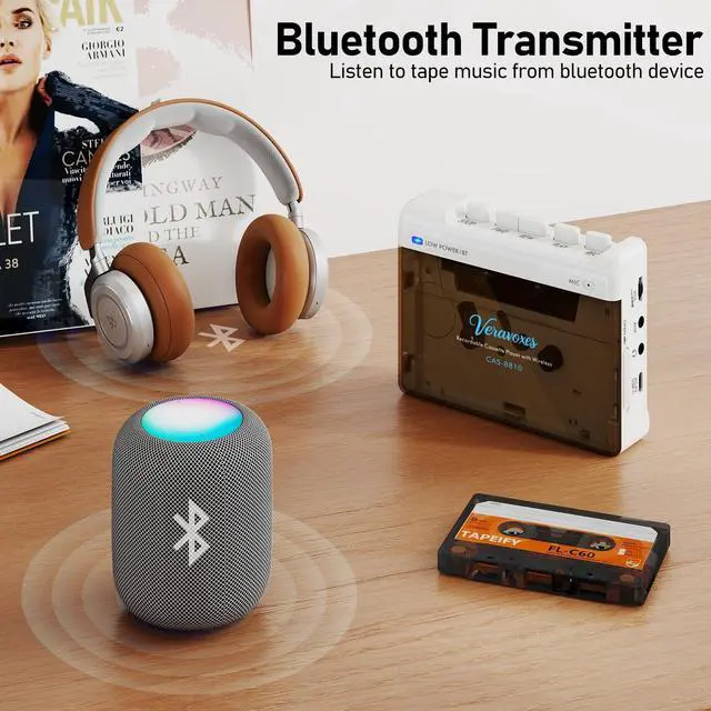 (Note: No external speakers; headphones required for playback) ^^ Bluetooth Cassette PlayerThis portable cassette player features a Bluetooth 6.0 transmitter for faster, more stable connections. Easily pair with Bluetooth headphones or speakers to wirelessly enjoy cassette music.