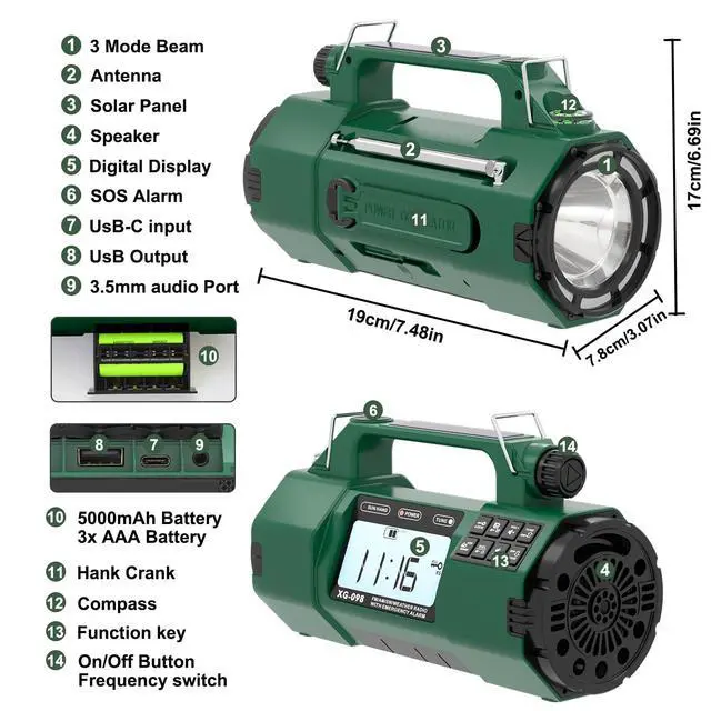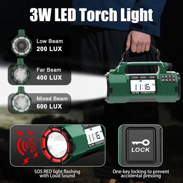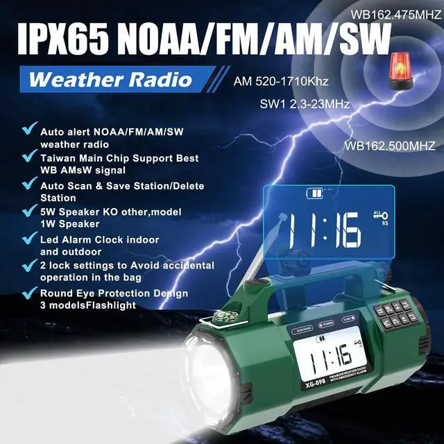 It's a versatile am/fm/sw noaa weather radio, great for outdoor adventures. Stay connected worldwide with this handheld radioyour go-to survival radio! ^^ Light up the dark with multiple flashlight modes and signal for help using the 135dB SOS alarm! This emergency crank radio flashlight is ideal for power outages or outdoor crises. It doubles as a solar-powered radio with hand crank, providing light and safety. A must-have emergency flashlight for any adventure! ^^ Use it as a bedside clock radio with alarm or for private listening via the headphone jack! This am/fm portable radio is perfect for daily use and emergencies.