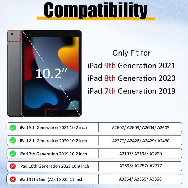 Exact Compatibility: Exclusively designed for 10.2 inch iPad 9th Gen 2021 (A2602/A2603/A2604/A2605), 8th Gen 2020 (A2270/A2428/A2429/A2430), 7th Gen 2019 (A2197/A2198/A2200). Not compatible with other iPad models. Apple Pencil not included ^^ Military-Grade