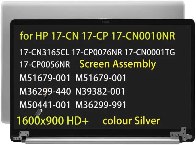 Compatible Model: Replacement for HP 17-CN 17-CN0010NR 17-CN0001TG 17T-CN300 17T-CN400 17-CN0001DS LCD Touch Screen Display Assembly SilverCompatible Model: Replacement for HP 17-CP 17-CP0056NR 17-CN3165CL 17-CP0076NR LCD Touch Screen DisplayM51679-001 M36299-440 N39382-001 M50441-001 M36299-991Resoluiton: 1600x900Procurement