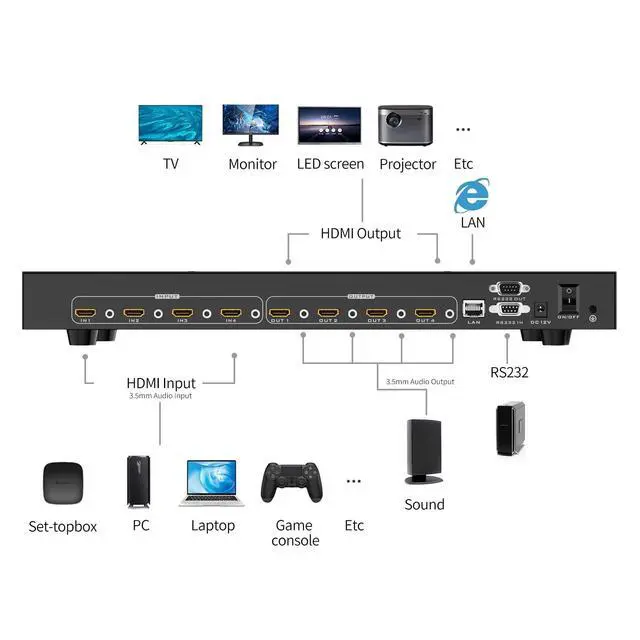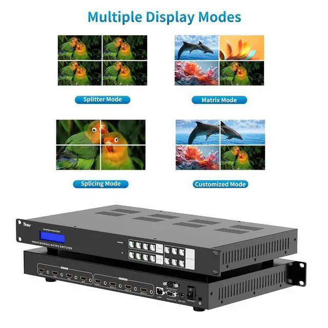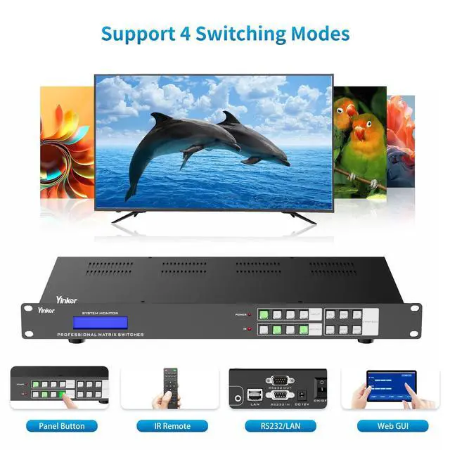^^ 4 Switching Methods: Allows switching by 1) Panel Button, 2) IR remote, 3) RS232/LAN, 4) Web GUI. Even support Android APP Control. The Backlit Button is vision-friendly and easy to operate. The LCD Info Screen allows to check out matrix status and information.