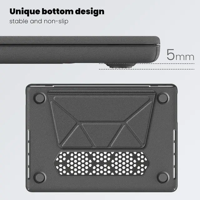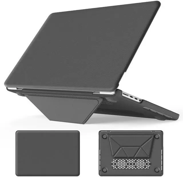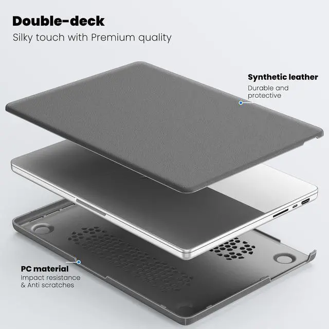 Touch ID (Model: A3434 / A3112 / A3401 / A3185 / A2918 / A2992 / A2779 / A2442). ^^ The case combines PU leather and PC material for enhanced durability. The fabric provides a comfortable, non-slip surface, while the PC material offers impact resistance and protection against scratches, ensuring your MacBook Pro 14 remains safe from daily wear and tear. ^^ This protective case features a built-in magnetic stand that allows for easy folding and stable positioning of your MacBook. The stand facilitates ergonomic viewing angles, enhancing comfort and productivity during prolonged use. ^^ The case is designed with precise cutouts that align perfectly with all ports and functions of the MacBook Pro 14. This ensures seamless access to charging ports, USB-C ports, and other essential interfaces without needing to remove the case. ^^ The bottom of the case includes a perforated design that promotes better airflow, aiding in heat dissipation. This feature helps maintain optimal operating temperatures for your MacBook, preventing overheating during intensive tasks.