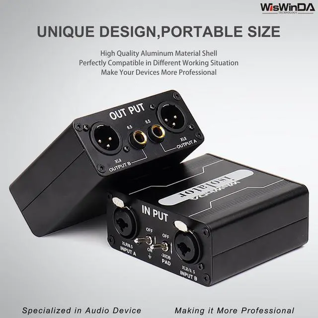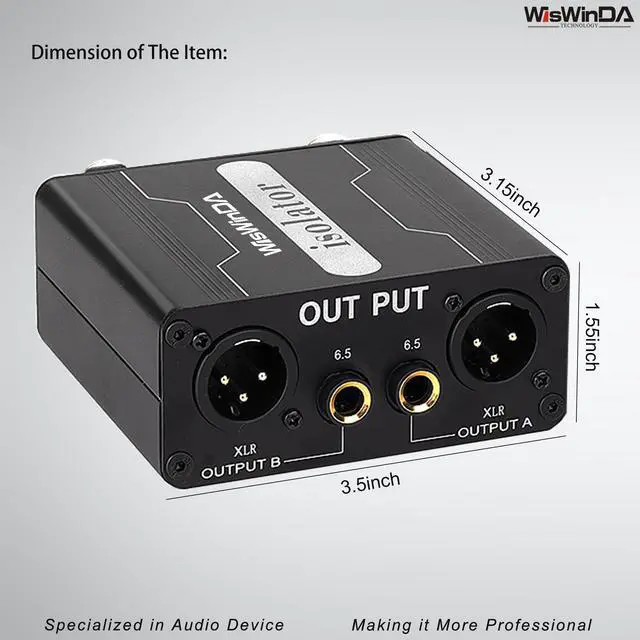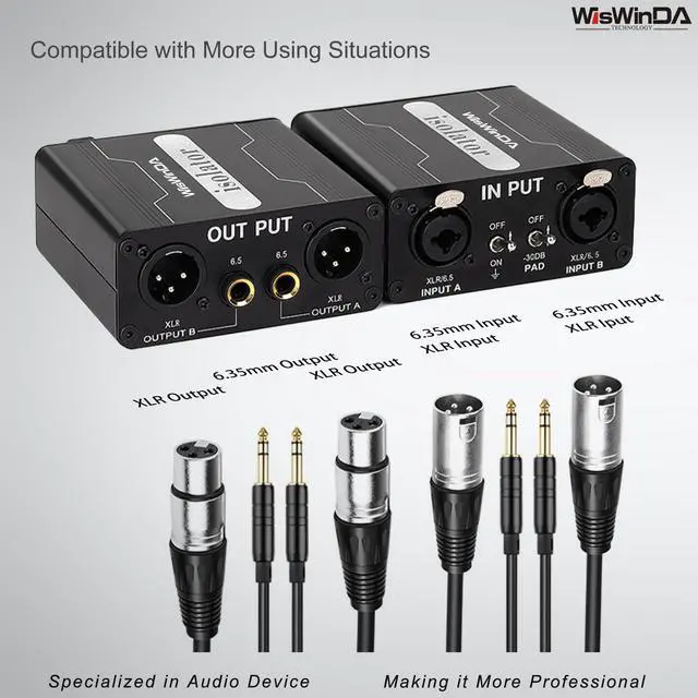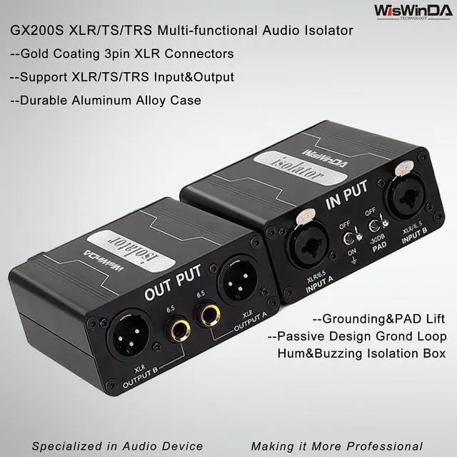 1. WisWinDa Pro GX200S 2Channels XLR/TS/TRS Passive Hum Eliminator Direct Box for Audio Equipments Ground Loop Isolator Noise Filter for Different Audio Systems Using Situations ^^ 2. XLR/TS/TRS Ground Loop Isolator/Noise Filter XLR could help you to reduce the noise from the car&home audio electric system, gives you HiFi quality sound output. Perfectly solve car and home stereo ground loop hum/buzzing noise problems. ^^ 3. Plug&Play Design--The Audio Isolation Transformer Alternator is easy to install, dont need any complicated tools, and it can be used after correct connecting XLR and 1/4 TS/TRS.