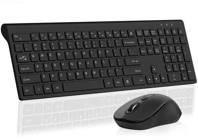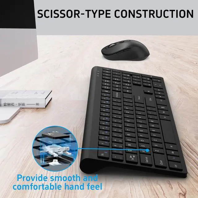 Advanced 2.4G technology increases the range to 33 feet, making it convenient for wireless typing. ^^ Long Battery Life & Auto Power Saving- This computer mouse and keyboard set features an ultra power-saving design, greatly extending the battery life. The wireless mouse keyboard combo has a smart sleep mode that saves power. The devices will enter deep sleep mode after 10 minutes of inactivity, and you can wake them up by pressing any button or key. ^^ Mouse Light Free Design - The wireless mouse adopts a light free design, with no strong and dazzling red light at the bottom.