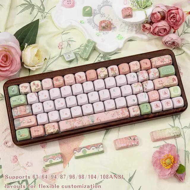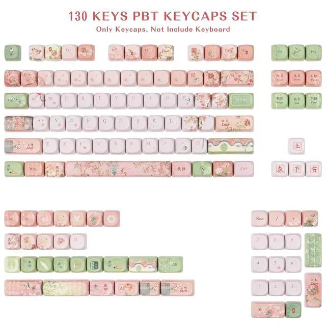 TIMSEKER 130 Keys Mint Green and Pink PBT Keycaps, Gradient Chinese Style Design, Five Side Dye Sublimation MOA Profile Keycaps for Mechanical Keyboard, Compatible with Cherry MX Gateron Kailh