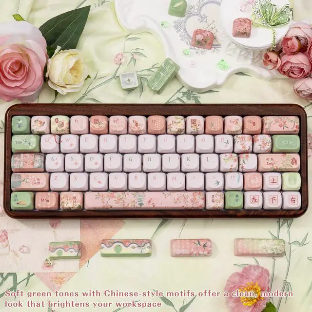 Chinese Aesthetic Design: Soft green keycaps with Chinese styles create a clean, modern look. Transforms your keyboard into a stylish, eye-catching centerpiece that brightens your desk and lifts your mood