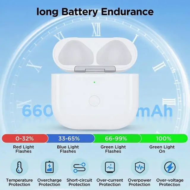 Wireless Charging: The AirPods 4 gen charger case supports both USB-C wired and wireless charging. A red indicator means its time to recharge; it turns solid green when the airpod 4 charging case is back to 100 %. ^^ Compact &