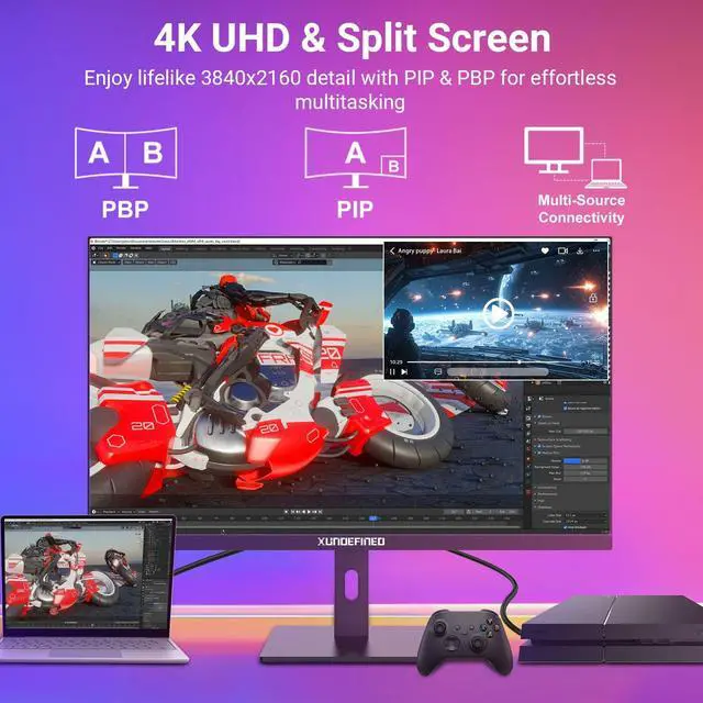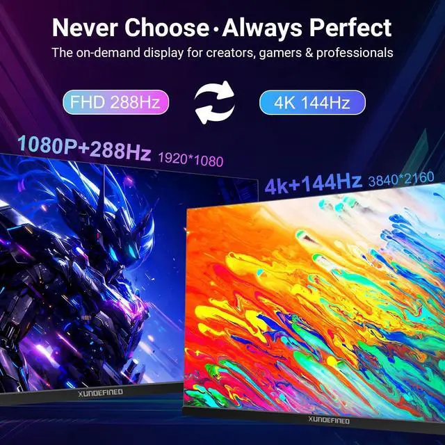 Experience Stunning 4K Clarity, With the 27 inch monitor 4k, you can seamlessly toggle between 4K UHD at 144Hz and FHD at 288Hz. Enjoy breathtaking visuals and lightning-fast response times for an unmatched gaming experience, making this the ideal 4k monitor for both casual and competitive gamers ^^ Boost Productivity with the 4K UHD mode and Picture-in-Picture (PIP) functionality, enabling you to multitask efficiently. Connect multiple sources easily with this 27 inch 4k monitor, making it perfect for professionals who need to juggle various tasks without missing a beat ^^ Transform Your Gaming Experience with the FHD 288Hz mode and 1ms MPRT response time.