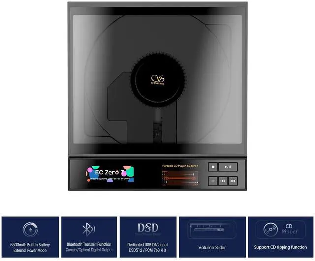 R2R DAC & Dual Tube HiFi CD Player SHANLING EC Zero T audiophile CD player combines advanced R2R DAC architecture with dual JAN6418 vacuum tubes, delivering warm, natural analog sound with ultra-low distortion. This unique design offers audiophiles a distinctive musical experience through a portable CD player ^^ Portable CD Player with Long-Lasting Battery Weighing only 669g and featuring a compact design, this CD player is ideal for travel and outdoor use. The built-in 5500mAh battery provides up to 8 hours of continuous playback, bringing high-fidelity sound anywhere you go ^^ Versatile Connectivity & High-Power Output Support CD playback, USB DAC input, and Bluetooth 5.3 transmission.
