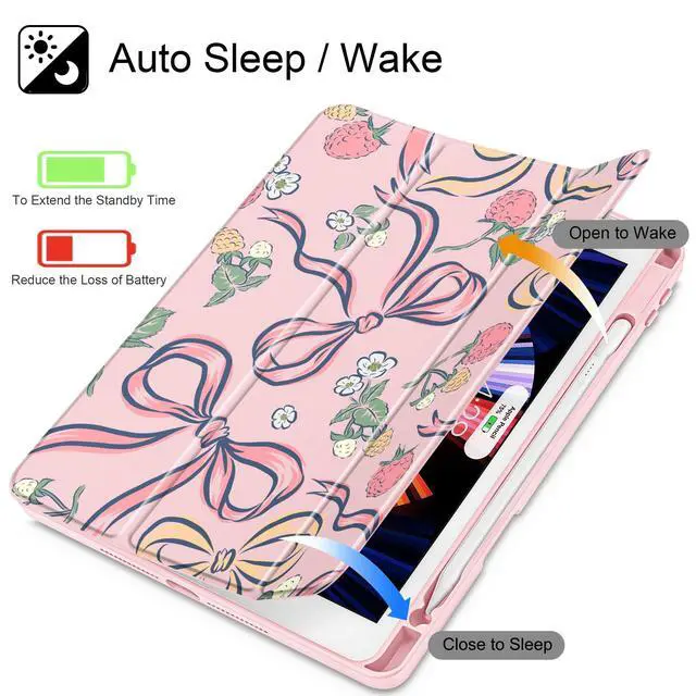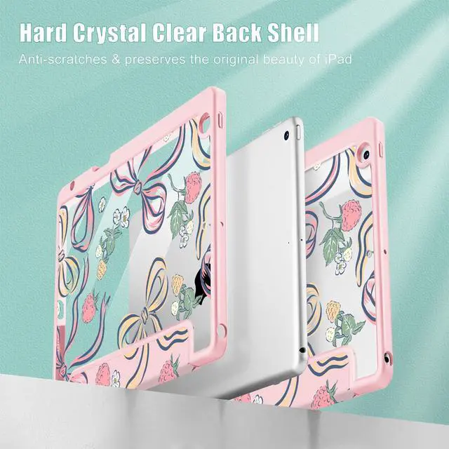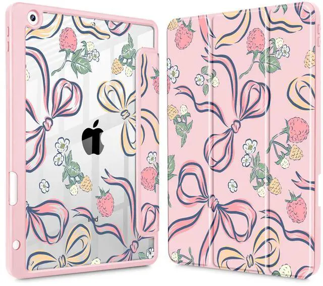 Lepeoac Case for iPad 9th/ 8th/ 7th Generation 10.2-Inch Case(2021/2020/2019 Release), [Built in Pencil Holder] Trifold Stand Auto Wake/Sleep Clear TPU Protection Back Cover, Raspberry Bows