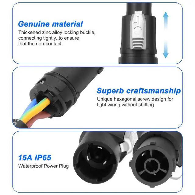 ^^ This PowerCON TRUE1 power wire cord is a fully lockable waterproof trunk connector equipped with a Cold Break Contact (CBC) mechanism that prevents accidental disconnection during live performances. It is specifically engineered for use in harsh and demanding environments. ^^ The ProwerCon True1 male-to-female power cord extension cable is designed for convenient plug-and-play operation. Simply connect the power connector to the desired device, tighten, and lock it into place. This ensures a secure connection and a reliable power supply. ^^ This PowerCON True1 power cable is widely used in the audio industry, including lighting equipment, LEDs, stage lighting, speakers, sound measurement, testing and control systems, automation and machine tools, as well as medical equipment, serving as a power source for various industrial devices.