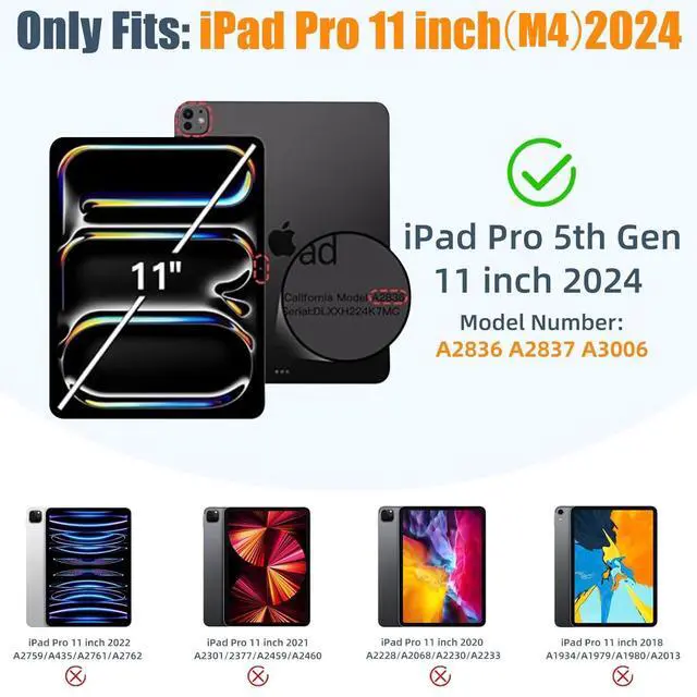 [ Compatibility ] Compatible with iPad Pro M4 Case 11 inch 2024. This case is designed specifically for iPad pro 11 inch case 5th Generation 2024; It is not compatible with any other devices. Please verify the model number (A2836 / A2837 / A3006) located on the bottom of your device before making a purchase. Please check the back bottom of your for iPad to find the model number before purchasing ^^ [Pencil Holder and Multi-angle Adjustable Support] This for iPad Pro M4 Case 11 inch 2024 tablet case has a built-in Pencil holder that makes it easy to carry Pencil and take it out.