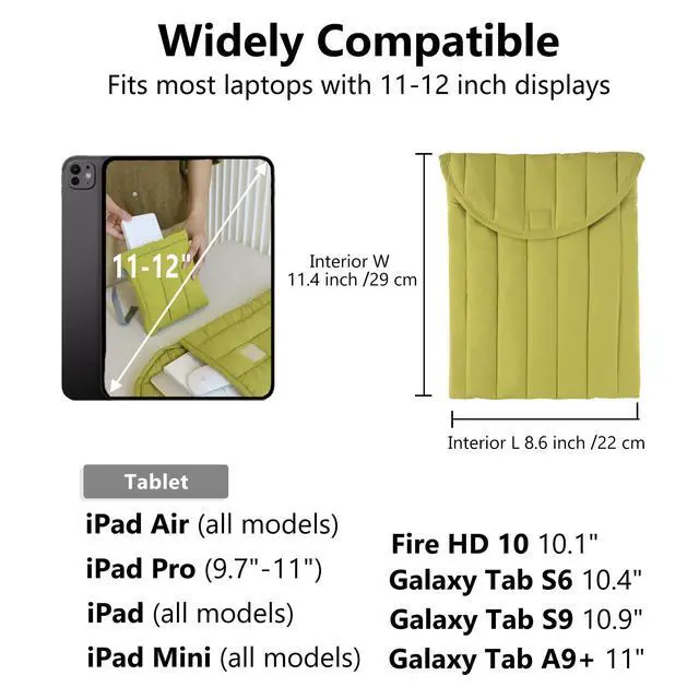 Wide Compatibility: 11-12 inch capacity, compatible with all 11-12 inch laptops. Compatible with 10.9 -inch iPad 10th generation, iPad 10.2 -inch 7th, 8th, 9th generation, 11-inch iPad Air M2, 11-inch iPad Pro M4, iPad mini 8.3 -inch 6th generation ^^