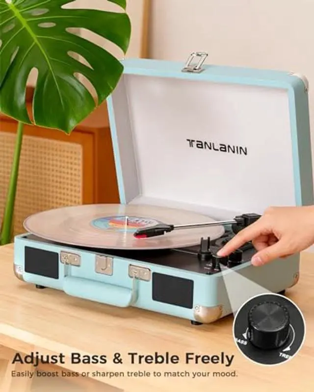 Intuitive Controls: Customize your audio experience with the treble and bass gain knobs on top of the panel, while the auto-stop function protects your records by halting playback at the end of a side.