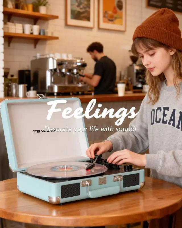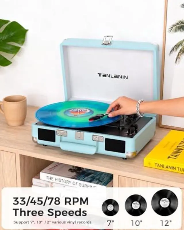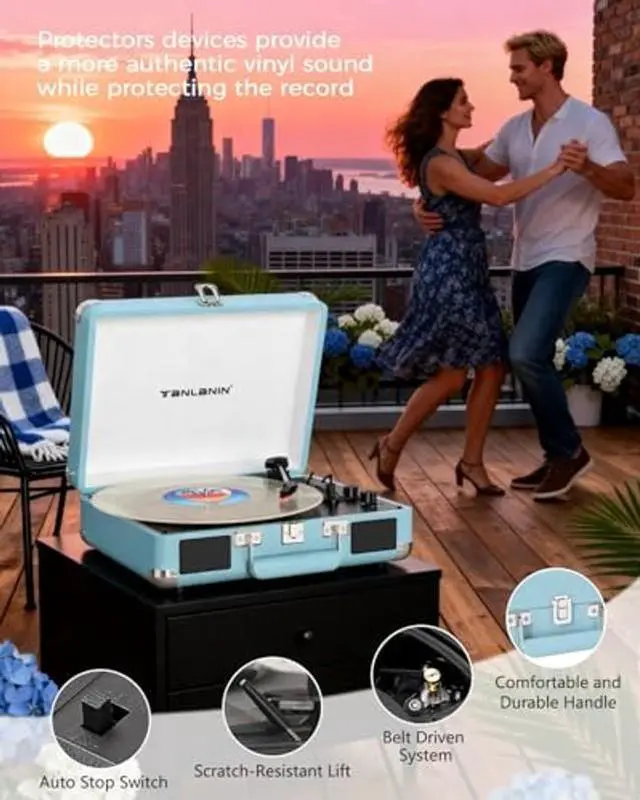 Lift Lever & Portability: Safely position vinyl with the integrated tonearm lift lever. The compact, lightweight suitcase design includes a secure latch for easy storage and transport. Ideal for home listening, outdoor gatherings, or as a stylish decor piece, this turntable merges nostalgic aesthetics with modern technology for a seamless audio experience.