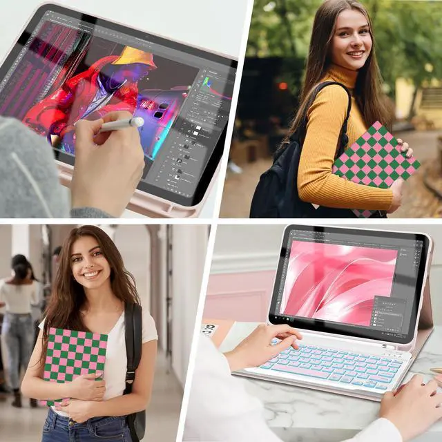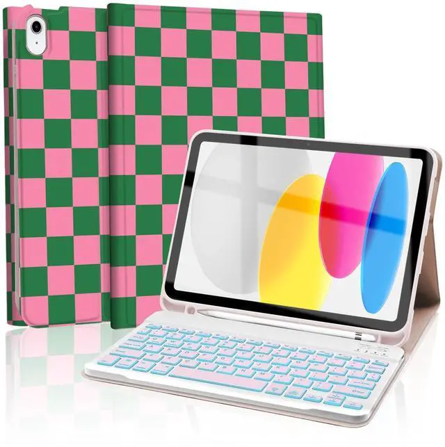 Mewealth for iPad 11th 10th Generation Case with Keyboard, Backlights LED Wireless Keyboard Cover with Pencil Holder for 11th A16 11-inch 202510th Gen 10.9 Inch 2022, Checkered Plaid Green-Pink