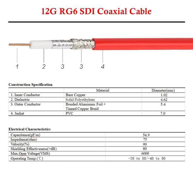 The 12G-SDI cable offers an impressive high data transfer rate of 12 gigabits per second (Gbps), ensuring smooth handling of HD, 3G, 6G, and 12G SDI video signals and making it suitable for demanding applications in broadcast and video production. ^^ Designed to support 4K Ultra High Definition (UHD) video resolutions, the 4K SDI cable ensures crisp and clear image quality, meeting the requirements of modern high-resolution video. ^^ This SDI cable features a robust construction with RG6 SDI Cable, providing low attenuation, and shielding against interference. With double shielding and brass copper connectors, it ensures durability, flexibility, and reliable performance, even in challenging environments such as outdoor use.