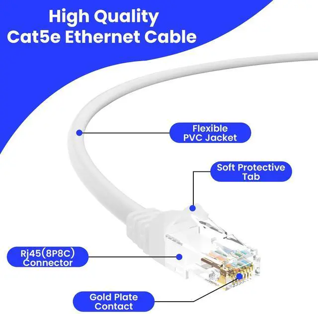 Cat5e Ethernet Cable 100FT, High Speed Patch Internet Cord with Standard RJ45 Connector, Long White Snagless Cat 5e Cable, Indoor & Outdoor, UTP Network LAN Wire for PC, Router, Modem, TV, PoE, PS5