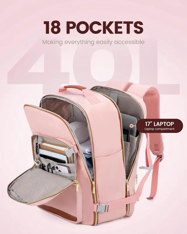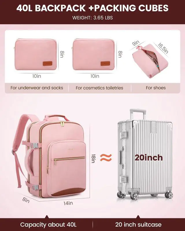 Multiple Pockets: The travel backpack for women with a 40L capacity and 4 main compartments, this travel backpack can meet both your daily and travel needs. It can easily accommodate all your items for a 3-5 day trip. ^^ Includes 3 Packing Cubes and
