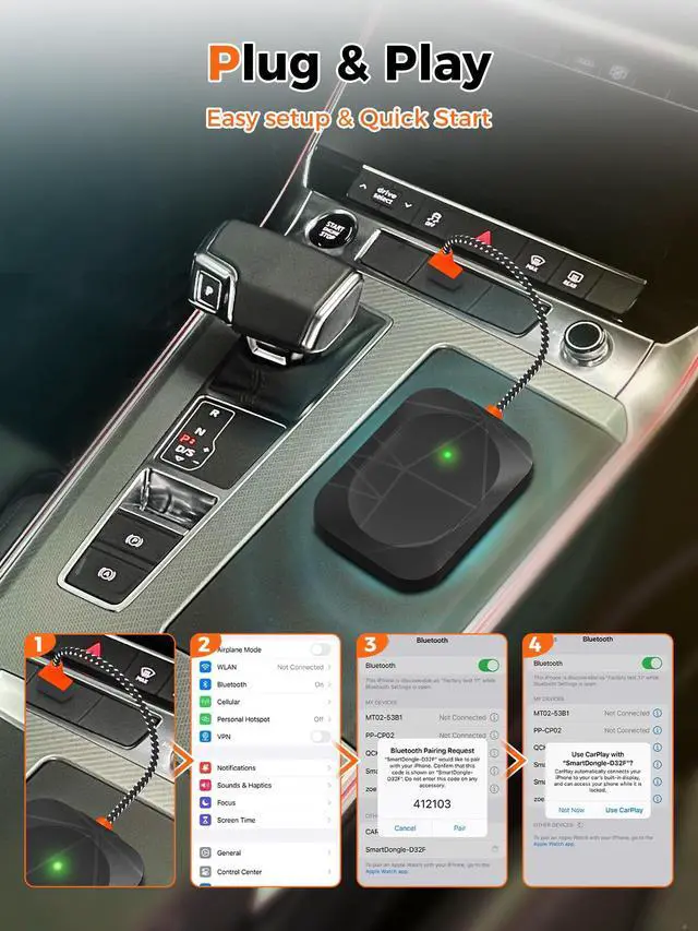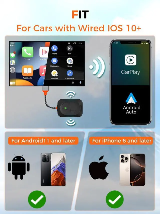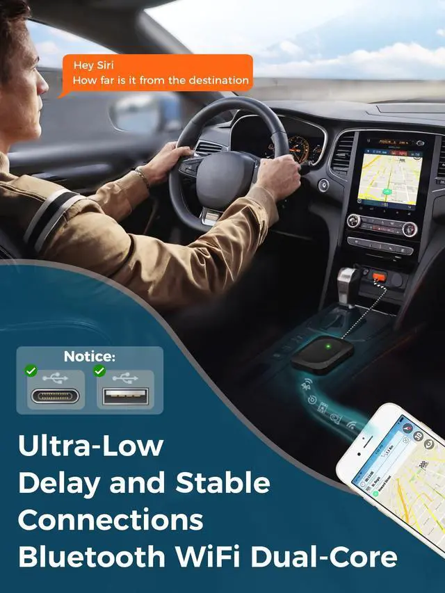 Seamless Wireless CarPlay Adapter Instantly upgrade your factory-wired CarPlay to wireless. Say goodbye to messy cablesjust start your car, and the Wireless CarPlay Adapter connects automatically every time ^^ Plug & Play in Seconds No apps, no drivers, no hassle. Simply plug the Wireless CarPlay Adapter into your USB CarPlay port, pair once, and enjoy automatic reconnection for future drives ^^ Fast & Stable 5G Performance Built with advanced 5G chip and low-latency technology, this Wireless CarPlay Adapter ensures smooth navigation, Siri voice control, and music or video streaming without lag or dropouts ^^ Wide Compatibility Works with 98% of CarPlay-enabled vehicles and iPhone models iOS 10+.