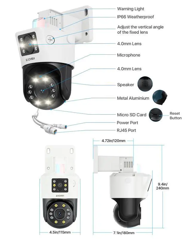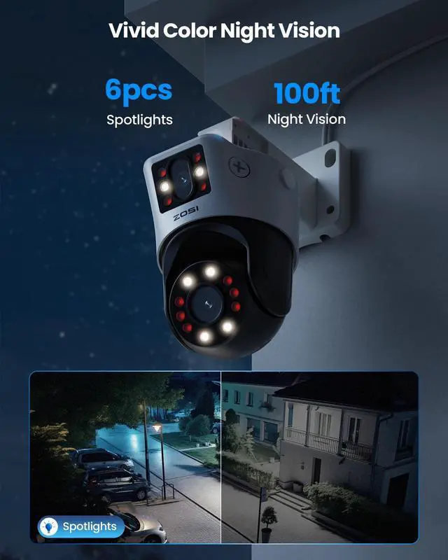 (1). [ Panoramic 360 View with Dual-Lens Rotation ] __ The ZOSI PoE dual-lens camera provides a complete 360 view, featuring 355 horizontal and 90 vertical rotation, ensuring nearly blind spot-free coverage. This makes it an ideal solution for monitoring large areas, offering superior surveillance flexibility compared to fixed-lens cameras. ^^ (2). [ Ultra HD 4MP Resolution & 3 Night Vision Modes ] __ Experience exceptional detail with 4MP ultra-high-definition resolution (2560x1440), delivering crisp, clear images. The camera supports three night vision modesblack and white, full-color, and smart night visionproviding visibility up to 30 meters, ensuring security even in total darkness.