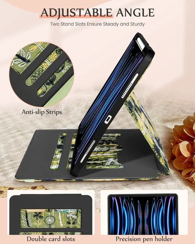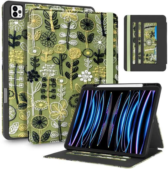 Card Slots & Auto Sleep/Wake: This embroidered tablet case has two card slots for bank cards, business cards and other cards. Built-in magnetic strip, this for iPad Pro 12.9 (2022/2021/2020/2018) & Air 13 case has an auto sleep/wake feature, no wasting the power energy and extend your tablet standby time ^^