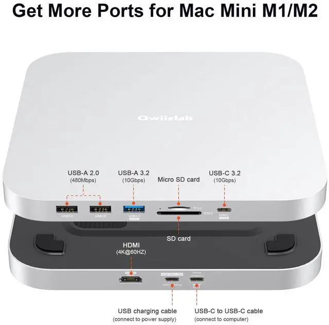 INTERNAL STORAGE EXPANSION - supports M. 2 PCIe SATA and NVMe SSD up to 8TB to expand storage for Mac mini and Mac studio. ^^ SUPER-SPEED DOCKING STATION - features with 10Gbs USB Type-C port, 10Gbps USB Type-A port, 2x USB 2.0 data ports and SD/microSD card readers up to 104MB/s for quick access to essential peripherals. ^^ ULTRA HD VIDEO OUTPUT - supports to extend the screen of your Mac to one external monitor through HDMI 2.0 port (4K@60Hz). ^^ COMPACT USER-FRIENDLY DESIGN - adds it to your Mac with a slim enclosure made of aluminum alloy, user-friendly installation for M.