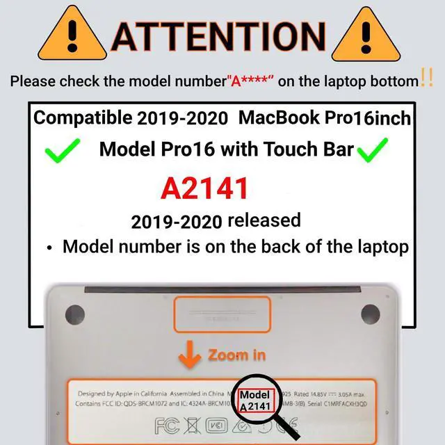 How to order the correct size protective case for your Macbook? Please check your Macbook model "AXXXX" at the back of the laptop. "XXXX" are numerical numbers. According to your Macbook model, please choose the same model at the size section. Model number location map is available at the picture section ^^ COMPATIBILITY - This case is only compatible with Model A2141(Macbook Pro 16" with Touch Bar & Touch ID, Release 2019-2020). Macbook Pro 16" refers to the laptop display screen diagonal length is 16". Not the length of laptop. You can check Macbook model differentiation diagram at the picture section ^^ DIMENSION -