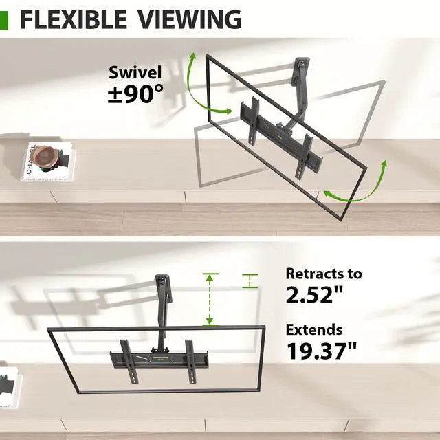 Full Motion Flexibility: With a tilt of +5/-12 and up to +/-90 swivel (Maximum swivel angle depends on your TV size), this adjustable TV bracket reduces glare and enhances viewing from any spot in the room. You can extend the arm 19.37 for a better view or pull it back to 2.52 to save space ^^