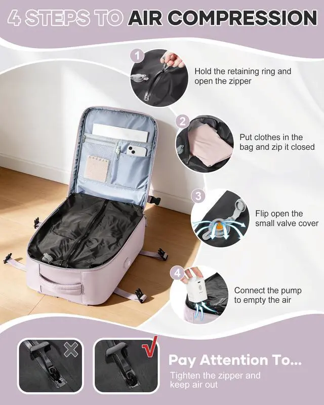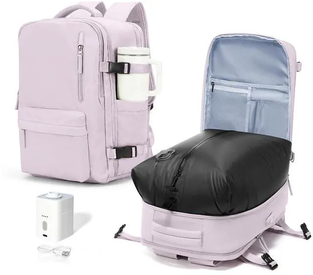 Vacuum Compression System - Innovative vacuum compression technology doubles packing efficiency! Features a vacuum valve supporting both electric pump quick-compression and manual air release, instantly eliminating wasted space while expanding storage capacity for hassle-free travels. ^^ Portable Vacuum Pump - Comes with a compact vacuum pump for on-the-go convenience. Multiple nozzle attachments allow precise air extraction, whether you're quickly compressing clothes or adjusting storage space. ^^ Multi-Functional Design - Meticulously crafted for business trips, workouts, and daily commutes. Features a smart compression system with multi-functional inner pockets in the main compartment, plus a front quick-access pocket for essentials.