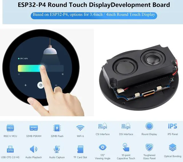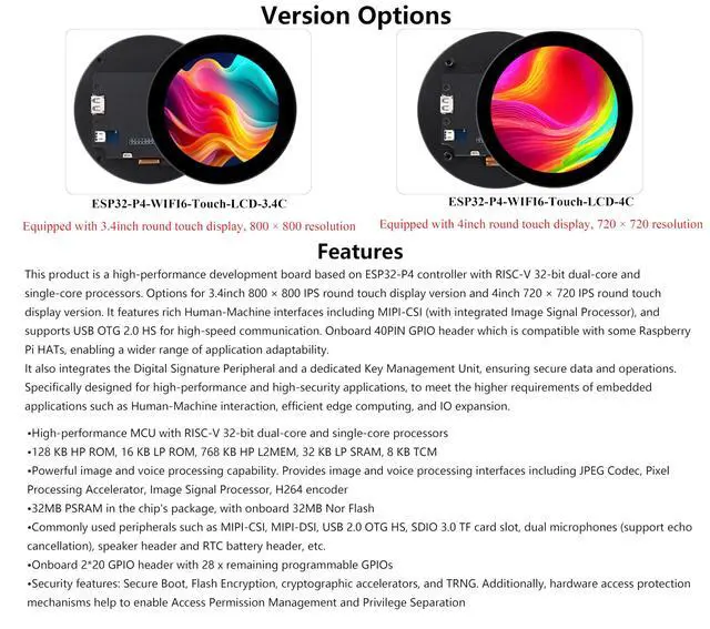 ^^ Round Touch Display: 3.4 inch 800 x 800 IPS Round Touch Display, 170 wide viewing angle, high contrast. Supports 10-point sensitive touch, seamlessly combining intuitive operation with rapid response for efficient and convenient development ^^ Powerful image and voice processing capability: Provides image and voice processing interfaces including JPEG Codec, Pixel Processing Accelerator, Image Signal Processor, H264 encoder. ^^