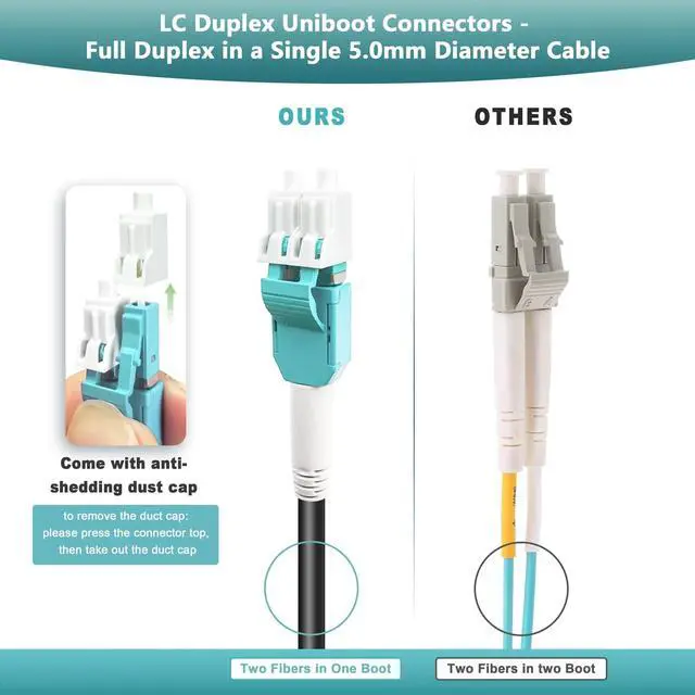 Industrial TPU Jacket features strong tensile strength, high abrasion resistance, water proof, high and low-temperature resistance, uv-resistant, bending resistant. Suitable for Various Harsh Installation Environments such as roads & snowfields & industrial fields & construction sites. ^^ Can be installed overhead, buried directly in the ground, or routed through conduits. ^^ Combination of Metal Steel Armor and Glass Fiber Yarns Provides Dual Physical Protection Against Rodents ^^ 5.0 mm Outer Diameter Outdoor Fiber Optic Cable, a larger diameter compared to 3.0 mm cables: Thicker 5.0 mm cables suitable for environments where the cable might be subjected to more wear and tear, such as outdoor installations, industrial settings, or areas with a higher risk of physical damage. ^^ Multimode OM3 Duplex LC Uniboot connector: The uniboot design allows one cable to carry two fibers to reduce the cable bulk when routing. LC Uniboot Connectors enable simplified polarity correction in the field. No tool required