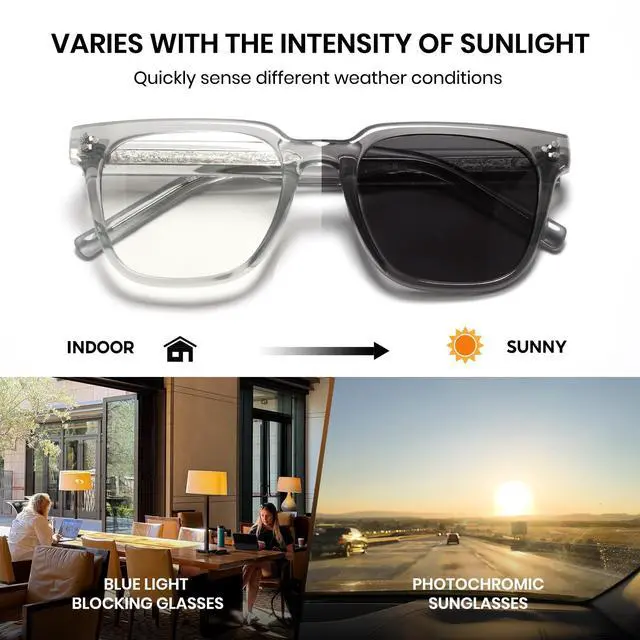 Innovative Photochromic TechnologyBoth lenses and frames adapt to light conditions, transitioning from clear to tinted when exposed to sunlight, and providing a unique and functional aesthetic ^^ 100%