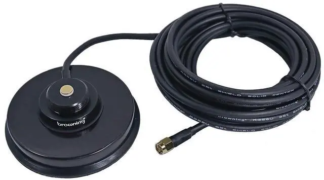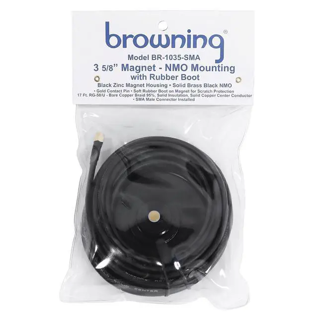 The Browning Premium 3-5/8 in. Magnet NMO Mounting with Rubber Boot and SMA Male features solid brass NMO, gold-plated contact pin and a soft rubber boot on magnet for scratch protection. The mount also features a RG58A/U cable with solid copper braid and center conductor, so it's built to last.