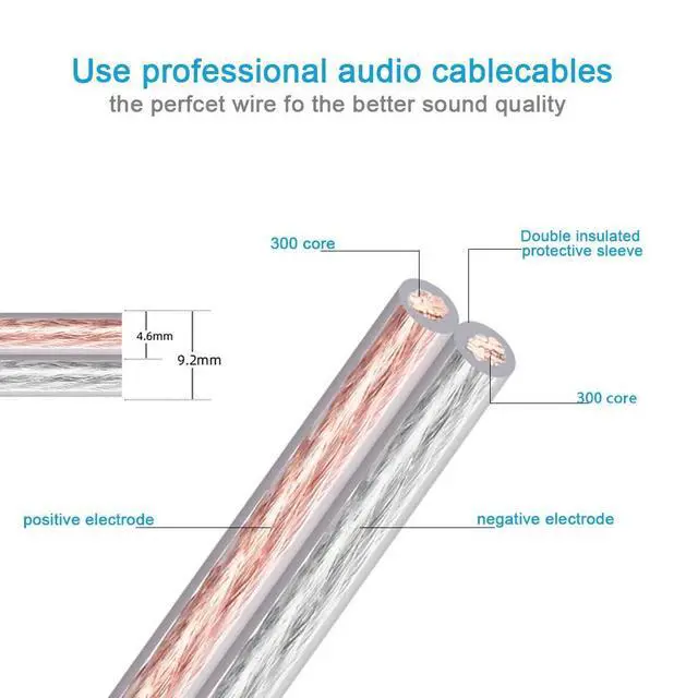 Built in Pure copper wire300core/13AWG, Higher transmission performance better flexibility, and greater durability. Gold Plated Banana PlugsGold Plated and solid copper, All metal banana plugs with 6 contoured contact springs, purpose-made for high current and low loss applications. Double Layer JacketDurable inner layer and a supple outer jacket provides excellent protection against abrasion while maintaining flexibility. No need to worry about cutting cablesUseage: compatible with audio components like speakers, A/V receivers, amplifiers