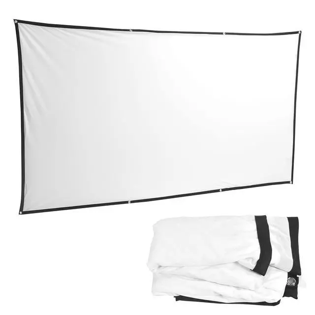 1. Made of polyester, the projection is clearer and brighter. The projection screen has no wrinkles when folded or flattened. 2. The diagonal of the 16:9 screen format brings you a different experience within a 160-degree viewable range. 3. You can use hooks, ropes, brackets, nails, doublesided tape to easily fix the projection screen on the wall/base. 4. Easy to, if the highcontrast screen is dusty, you can it with a damp cloth. 5. Suitable for home theater movies, education, conference room presentations, public displays, outdoor movies, etc.