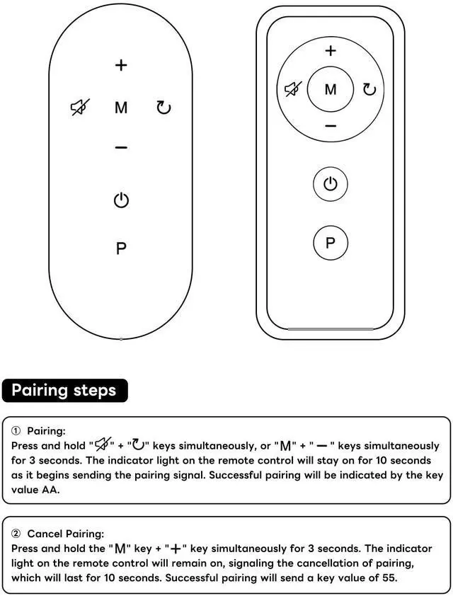 How to set up:2.Cancel Pairing:Press and hold the "M" key + "" key simultaneously for 3 seconds. The indicator light on the remote control will remain on, signaling the cancellation of pairing,which will last for 10 seconds. Successful pairing will send a key value of 55.