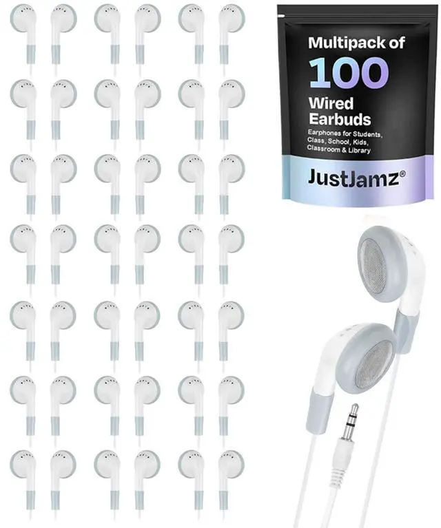 Bulk earbuds 100 pack in basic white, perfect for classrooms, schools, and students. Ideal for teachers, libraries, and group learning. ^^ Wired earbuds bulk set with a standard 3.5 mm jack, compatible with Chromebooks, laptops, tablets, desktop computers, smartphones, audiobooks, and MP3 players. ^^ Comfortable in-ear design with smooth hard plastic earbuds, offering a snug and secure fit for extended use. ^^ Durable cord length of 3 feet (1 meter) prevents tangling and ensures flexibility for everyday classroom use. ^^ Affordable multi-pack of disposable headphones, making them a great option for educators, businesses, and large events.