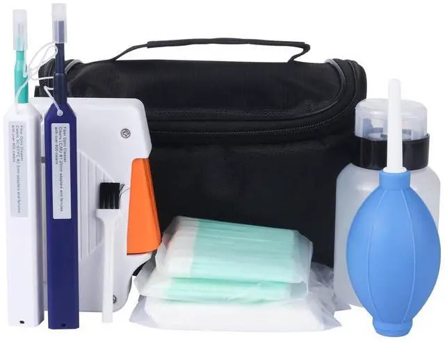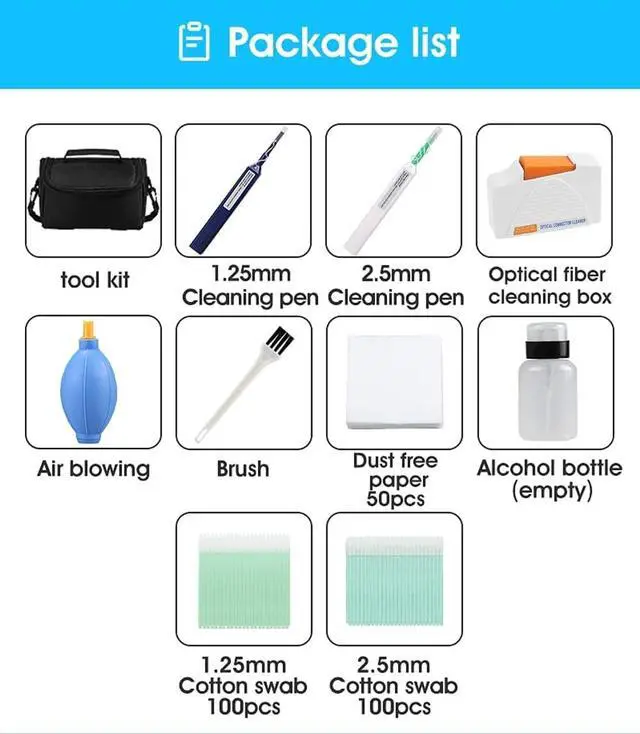 Package IncludedThis fiber cleaning kit includes 1.25 mm fiber optic cleaner pen and 2.5 mm fiber cleaning pen, fiber optic cleaning box, air blower, liquid dispenser, fiber cleaning swabs, fiber cleaner wipes, brush, fiber optic tool bag. The portable fiber cleaner contains everything you need to clean the UPC/APC connector end face and remove dust, oil, water and debris on the ferrule. Suitable for field testing. ^^ One Click Fiber Optic Cleaning PenUniversal 1.25 mm LC/MU and 2.5 mm SC/FC/ST fiber cleaner pen is designed to clean the ferrule end face of SC, FC, ST connector.